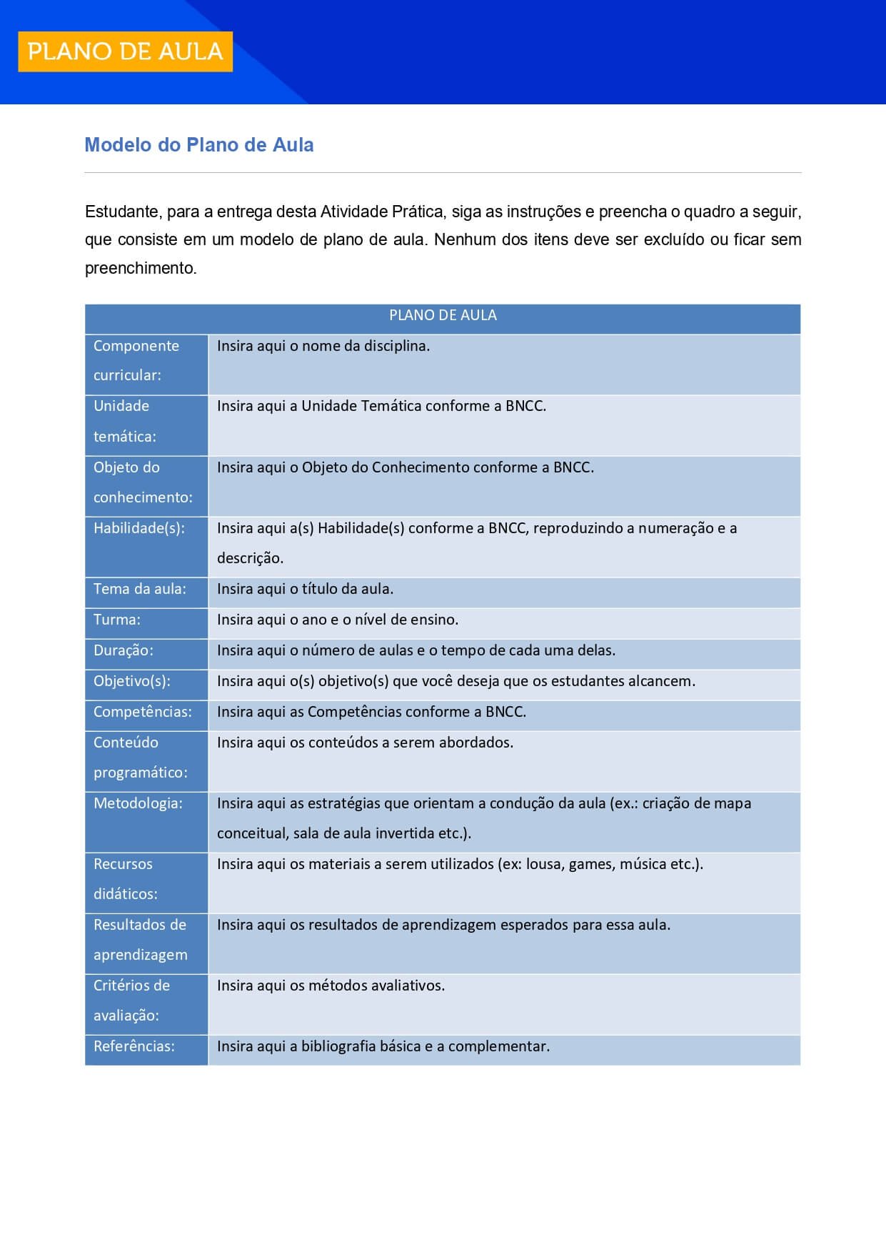que consiste em um modelo de plano de aula. Nenhum dos itens deve ser excluído ou ficar sem
