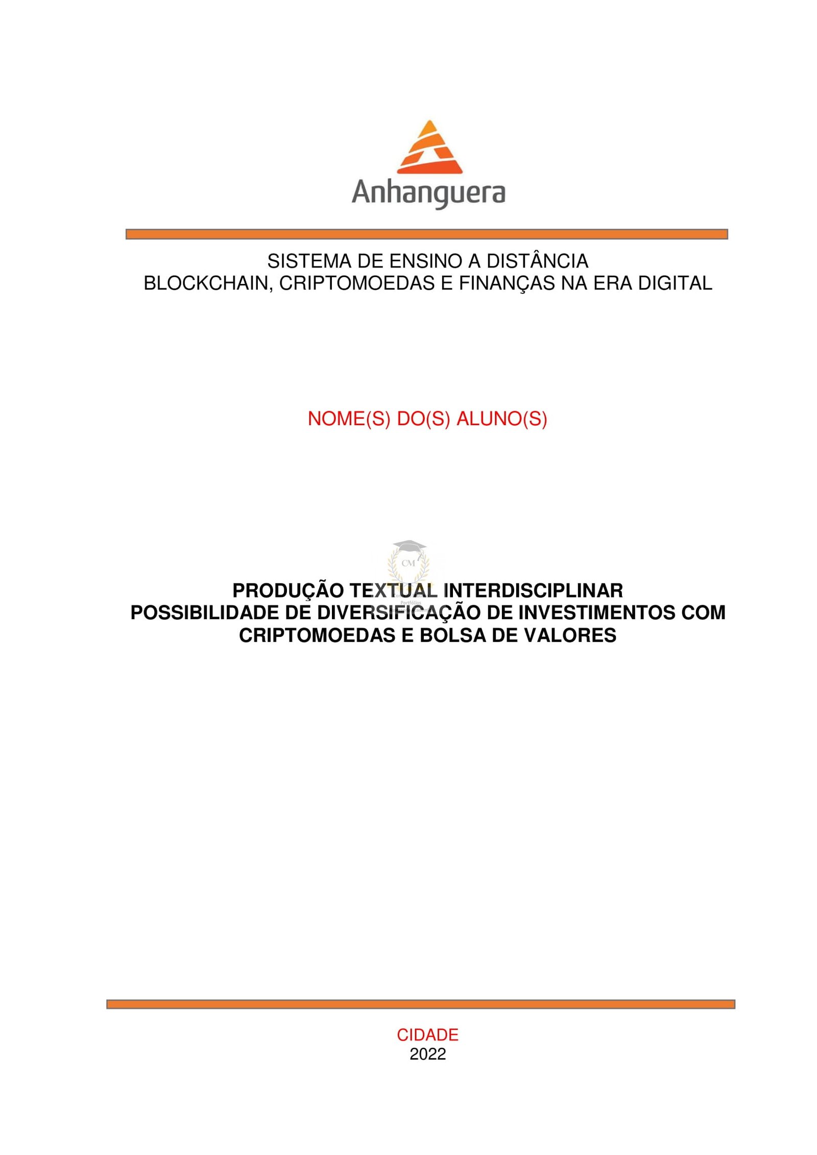 A proposta de Produção Textual Interdisciplinar que terá como temática “Possibilidade de Diversificação de Investimentos com Criptomoedas e Bolsa de Valores”. Escolhemos esta temática para possibilitar a aprendizagem interdisciplinar dos conteúdos desenvolvidos nas disciplinas desse semestre.