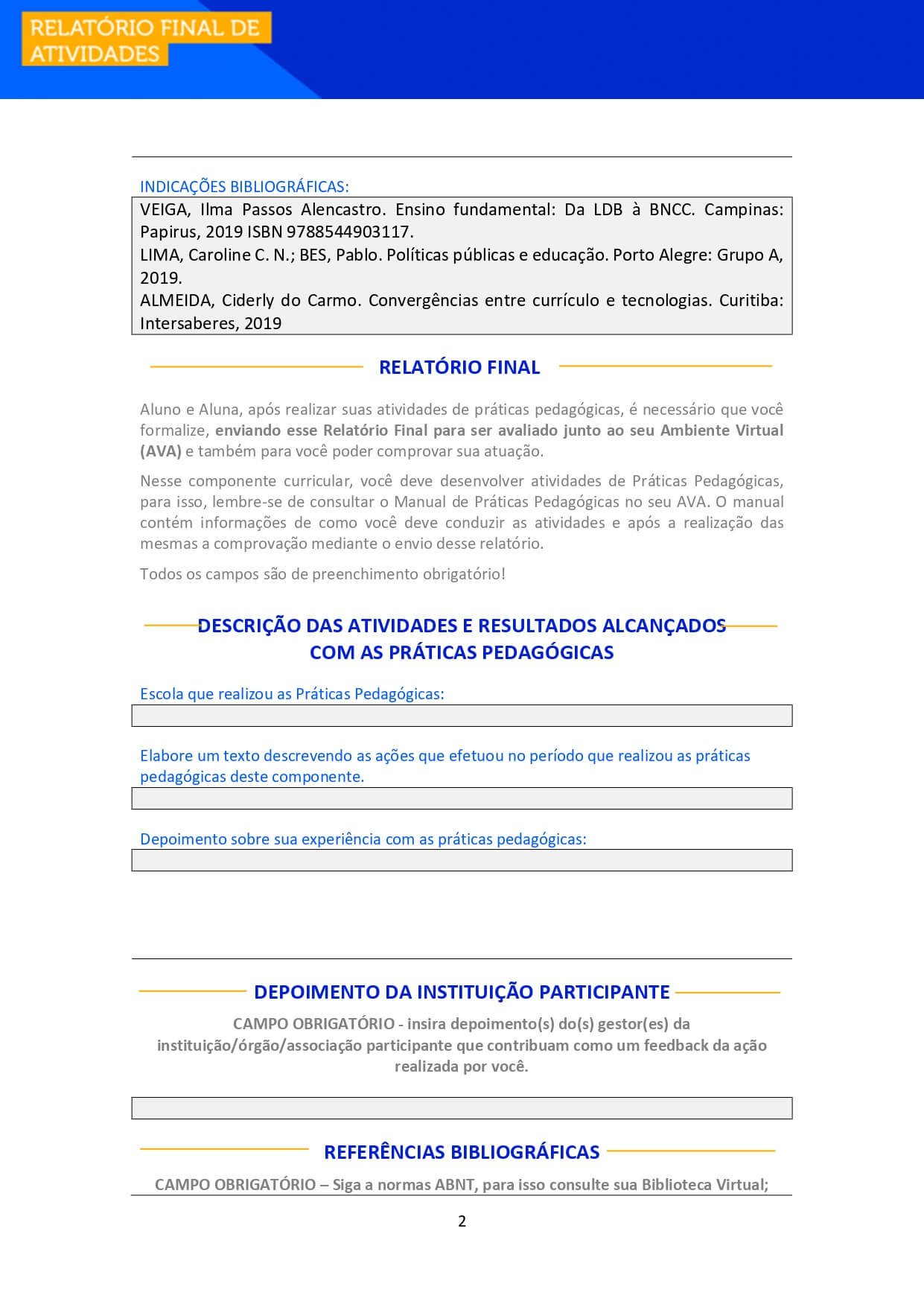 Aluno e Aluna, após realizar suas atividades de práticas pedagógicas, é necessário que você  formalize, enviando esse Relatório Final para ser avaliado junto ao seu Ambiente Virtual (AVA) e também para você poder comprovar sua atuação.Nesse componente curricular, você deve desenvolver atividades de Práticas Pedagógicas, para isso, lembre-se de consultar o Manual de Práticas Pedagógicas no seu AVA. O manual contém informações de como você deve conduzir as atividades e após a realização das mesmas a comprovação mediante o envio desse relatório.