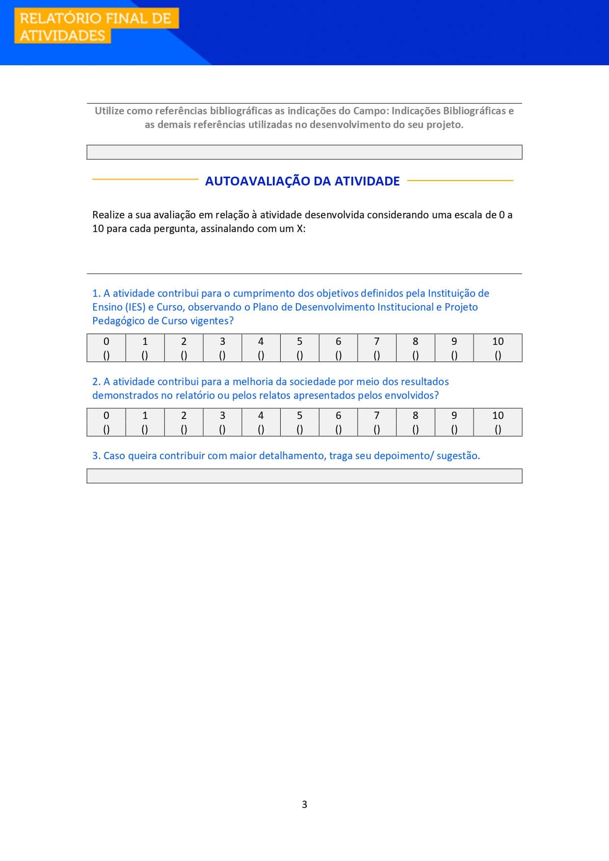 Realize a sua avaliação em relação à atividade desenvolvida considerando uma escala de 0 a 10 para cada pergunta, assinalando com um X: