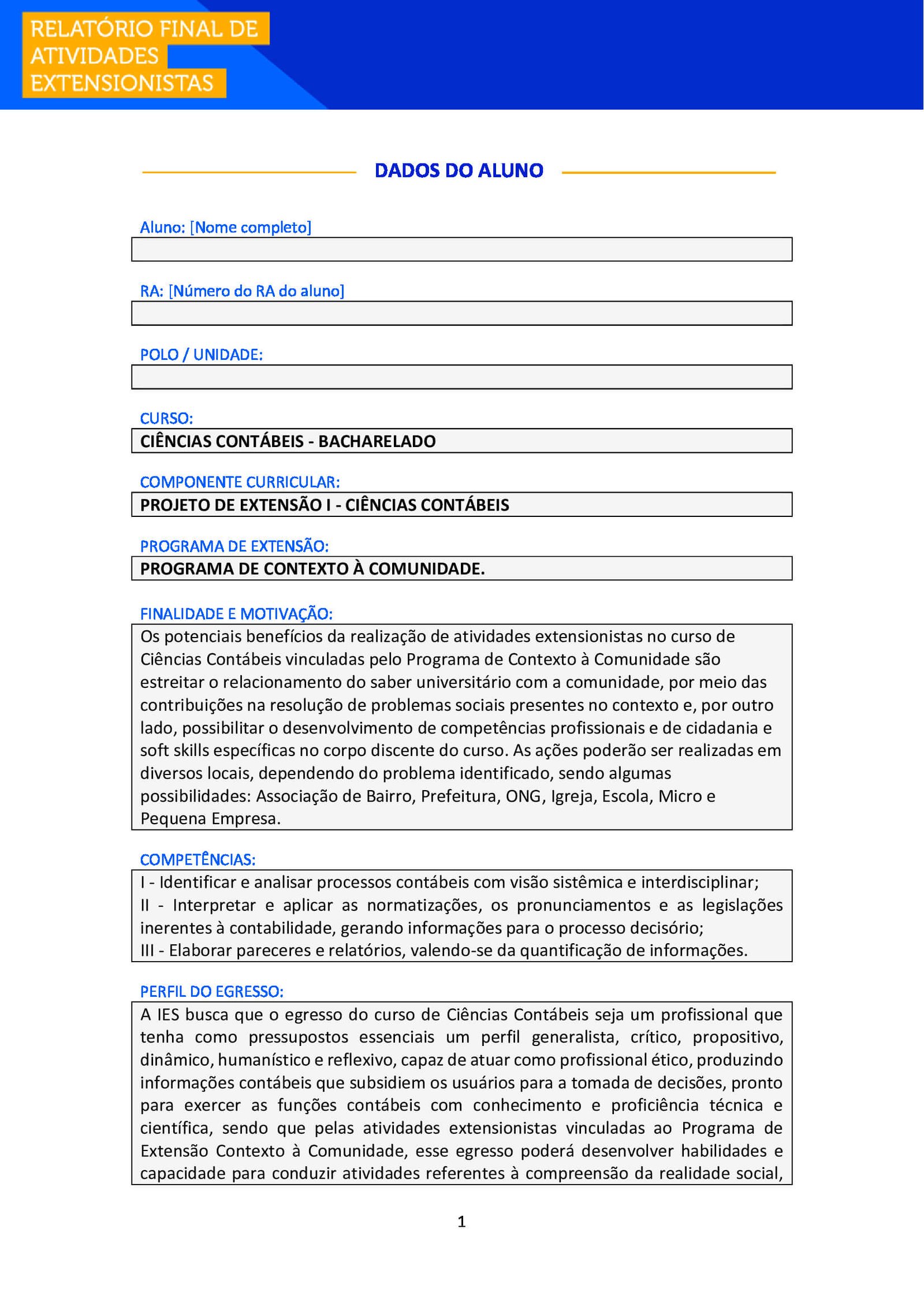 Aluno e Aluna, após realizar suas atividades de extensão, é necessário que você o formalize, enviando esse Relatório Final para ser avaliado junto ao seu Ambiente Virtual (AVA) e também para você poder comprovar sua atuação.