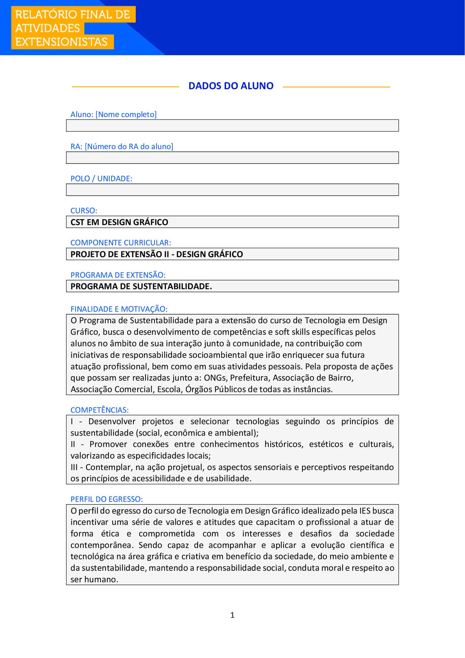 | Aluno e Aluna, após realizar suas atividades de extensão, é necessário que você o formalize, enviando esse Relatório Final para ser avaliado junto ao seu Ambiente Virtual (AVA) e também para você poder comprovar sua atuação. Para o preenchimento, busque as anotações junto ao TEMPLATE PCDA para auxiliar na apresentação das atividades desenvolvidas. Todos os campos são de preenchimento obrigatório! | ||||||||||