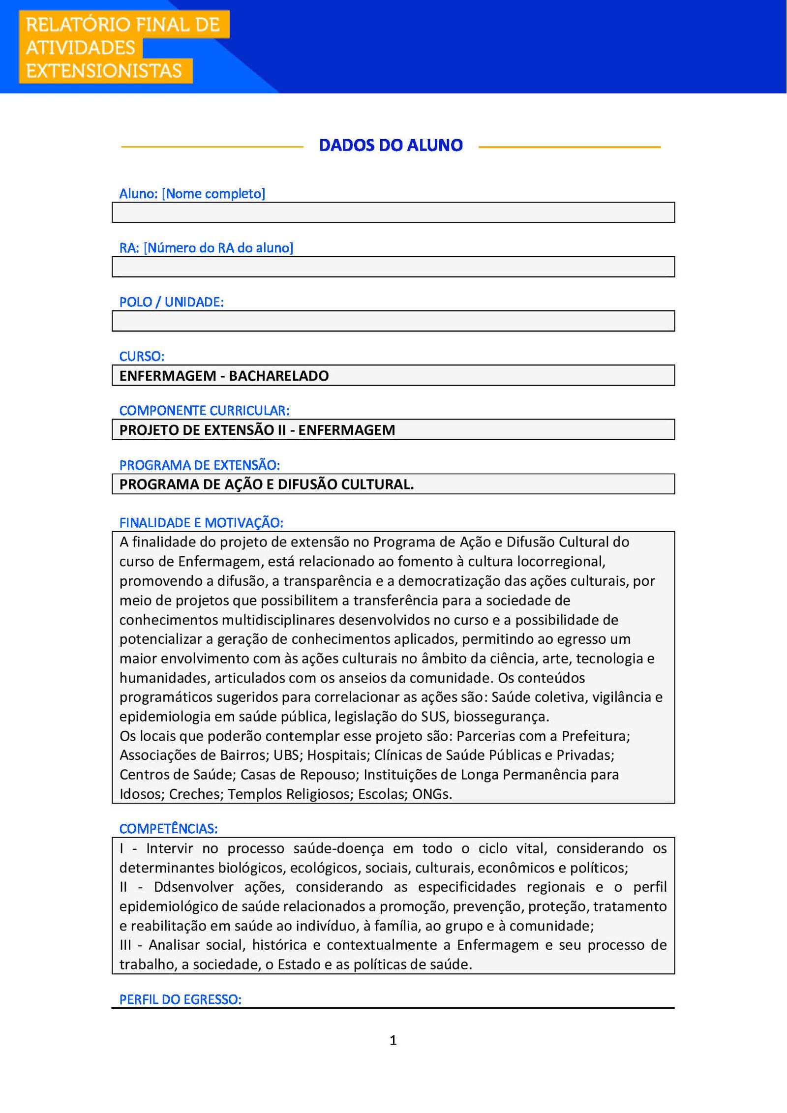 Aluno e Aluna, após realizar suas atividades de extensão, é necessário que você o formalize, enviando esse Relatório Final para ser avaliado junto ao seu Ambiente Virtual (AVA) e também para você poder comprovar sua atuação.