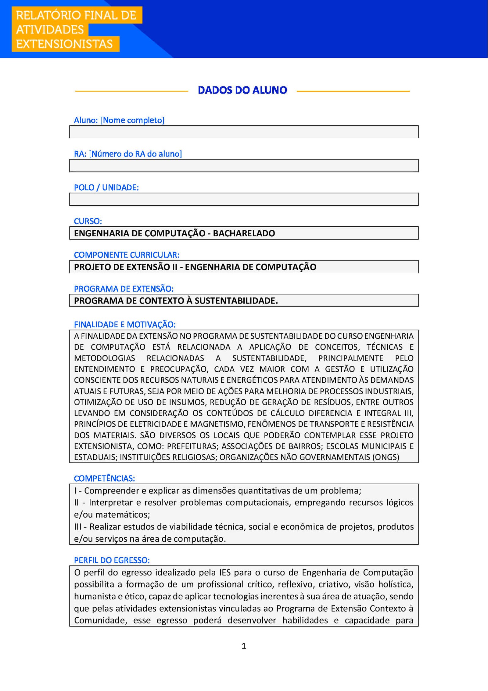 Aluno e Aluna, após realizar suas atividades de extensão, é necessário que você o formalize, enviando esse Relatório Final para ser avaliado junto ao seu Ambiente Virtual (AVA) e também para você poder comprovar sua atuação.