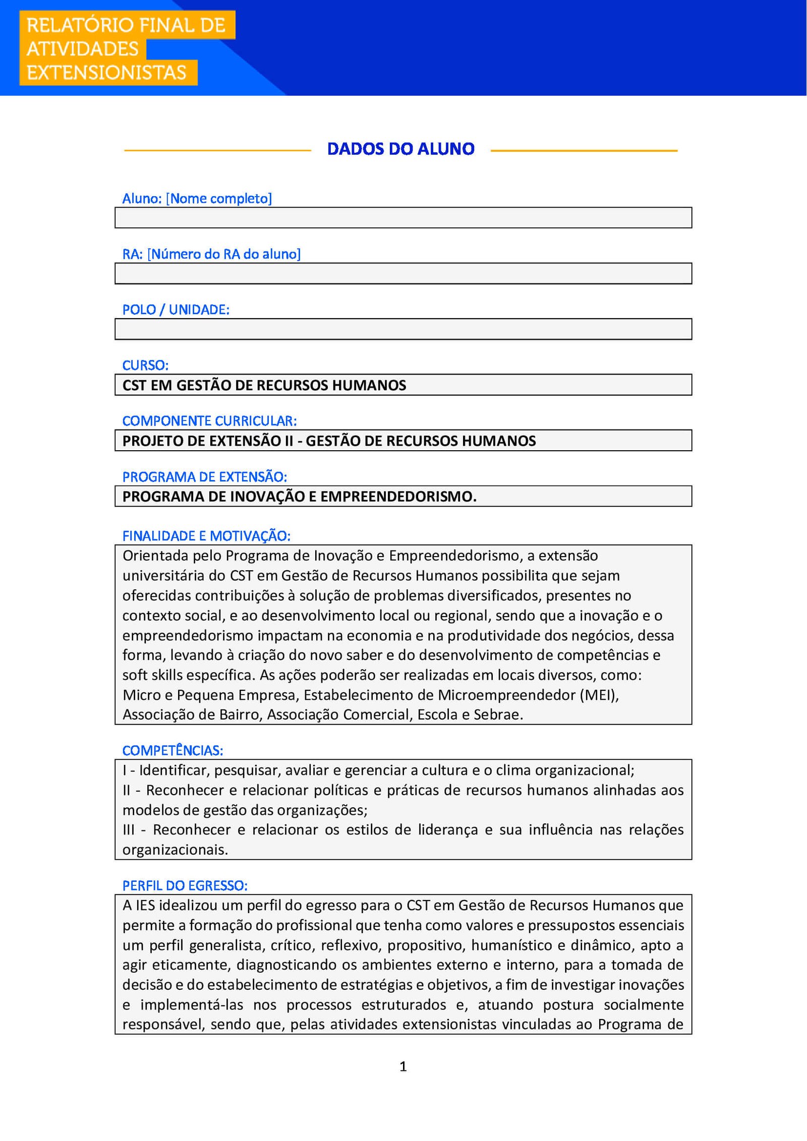 Aluno e Aluna, após realizar suas atividades de extensão, é necessário que você o formalize, enviando esse Relatório Final para ser avaliado junto ao seu Ambiente Virtual (AVA) e também para você poder comprovar sua atuação.