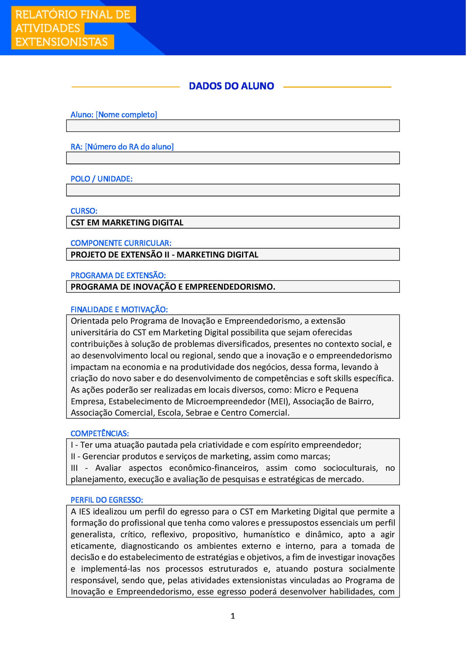 Aluno e Aluna, após realizar suas atividades de extensão, é necessário que você o formalize, enviando esse Relatório Final para ser avaliado junto ao seu Ambiente Virtual (AVA) e também para você poder comprovar sua atuação.