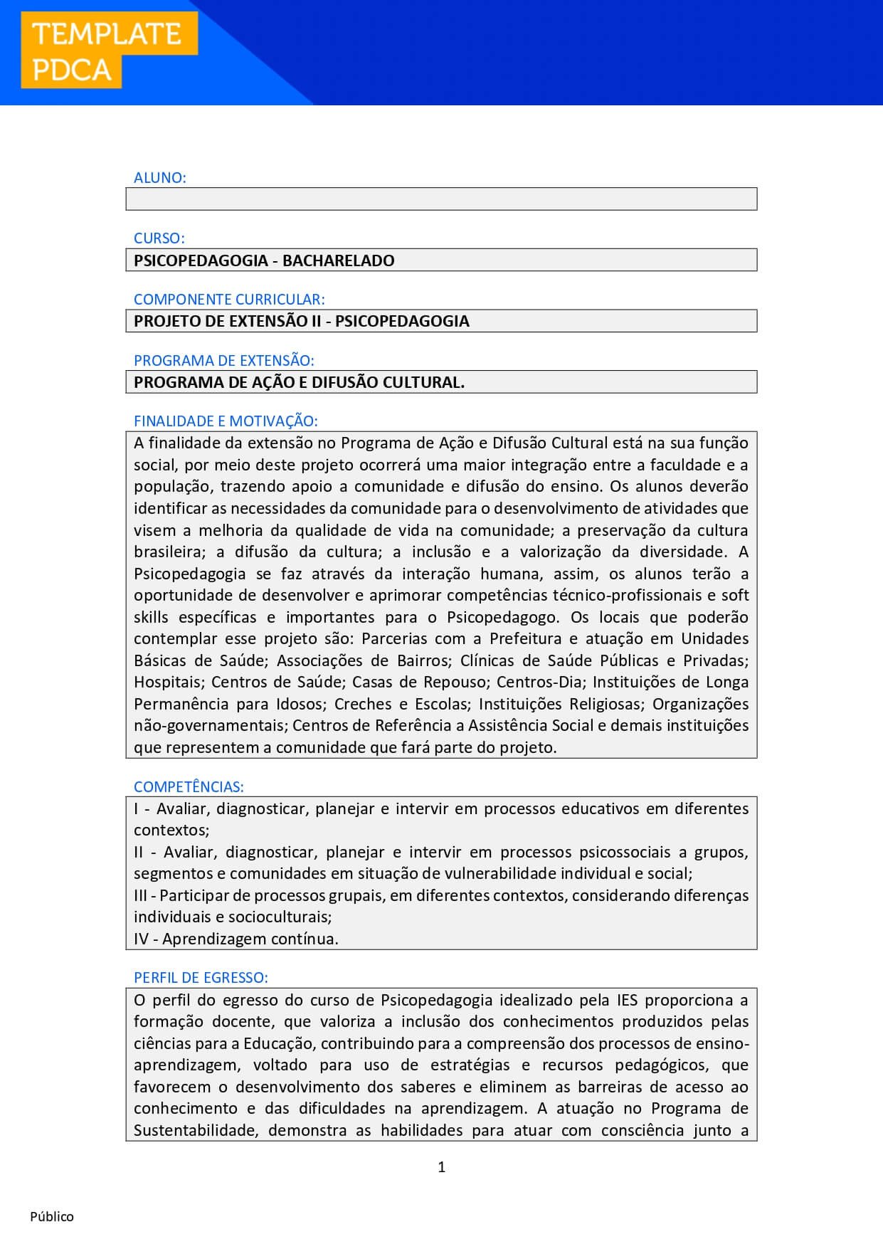 A finalidade da extensão no Programa de Ação e Difusão Cultural está na sua função social, por meio deste projeto ocorrerá uma maior integração entre a faculdade e a população, trazendo apoio a comunidade e difusão do ensino. Os alunos deverão identificar as necessidades da comunidade para o desenvolvimento de atividades que visem a melhoria da qualidade de vida na comunidade; a preservação da cultura brasileira; a difusão da cultura; a inclusão e a valorização da diversidade. A Psicopedagogia se faz através da interação humana, assim, os alunos terão a oportunidade de desenvolver e aprimorar competências técnico-profissionais e soft skills específicas e importantes para o Psicopedagogo. Os locais que poderão contemplar esse projeto são: Parcerias com a Prefeitura e atuação em Unidades Básicas de Saúde; Associações de Bairros; Clínicas de Saúde Públicas e Privadas; Hospitais; Centros de Saúde; Casas de Repouso; Centros-Dia; Instituições de Longa Permanência para Idosos; Creches e Escolas; Instituições Religiosas; Organizações não-governamentais; Centros de Referência a Assistência Social e demais instituições que representem a comunidade que fará parte do projeto.