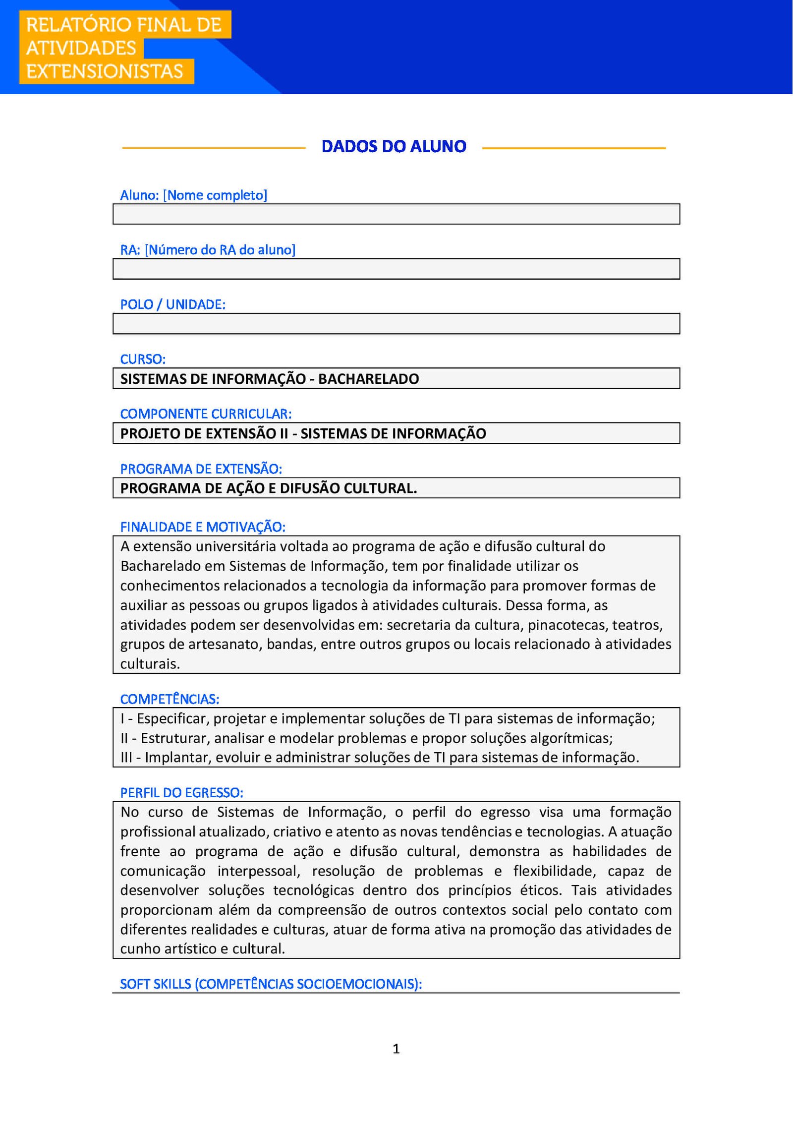 Aluno e Aluna, após realizar suas atividades de extensão, é necessário que você o formalize, enviando esse Relatório Final para ser avaliado junto ao seu Ambiente Virtual (AVA) e também para você poder comprovar sua atuação.