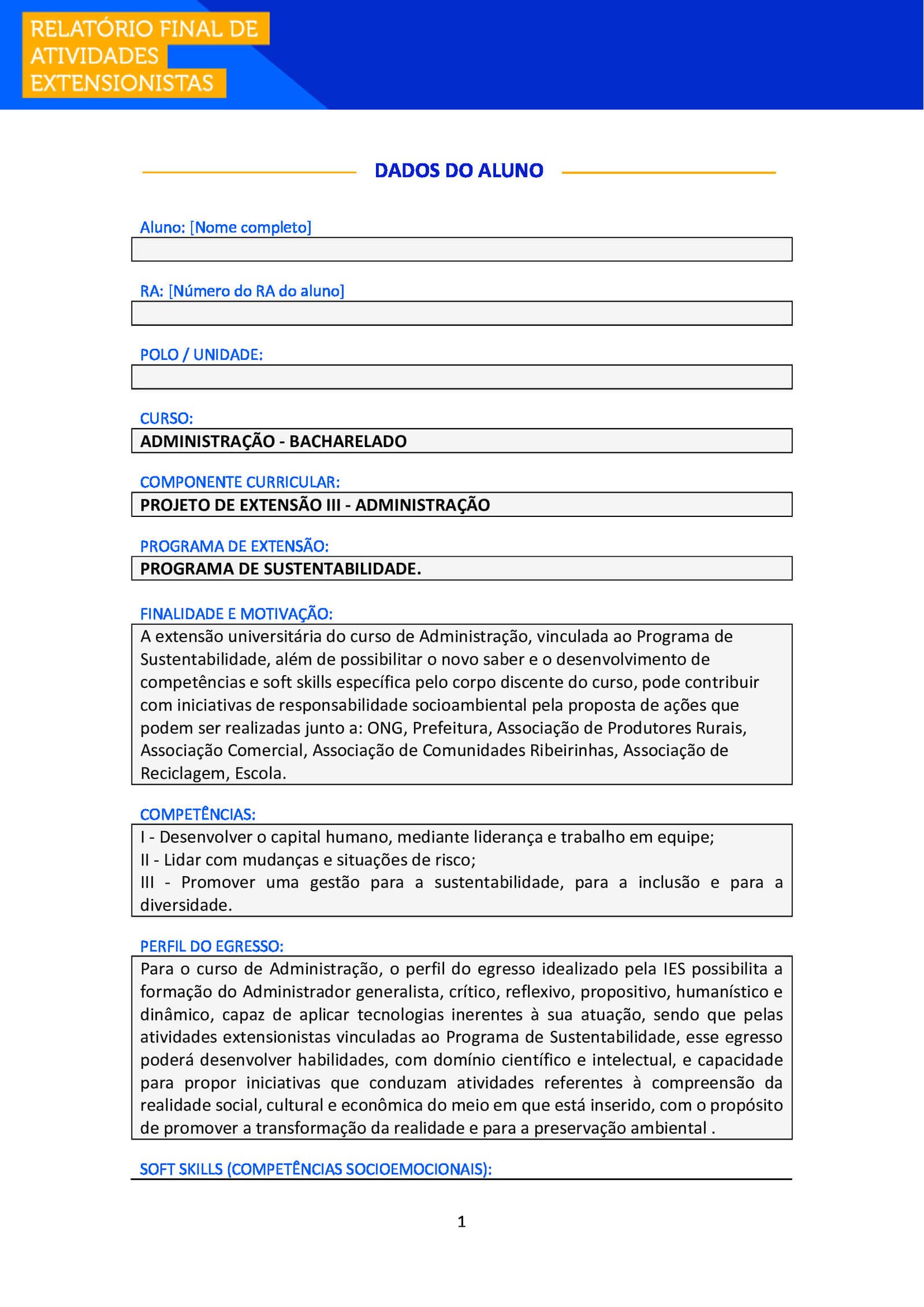 Aluno e Aluna, após realizar suas atividades de extensão, é necessário que você o formalize, enviando esse Relatório Final para ser avaliado junto ao seu Ambiente Virtual (AVA) e também para você poder comprovar sua atuação.