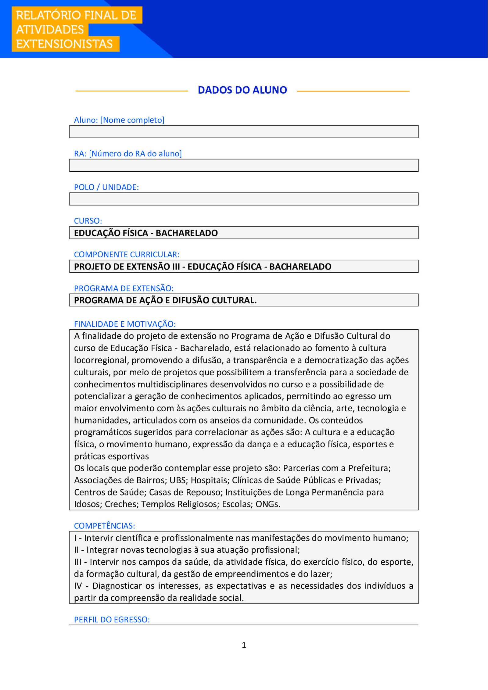 Aluno e Aluna, após realizar suas atividades de extensão, é necessário que você o formalize, enviando esse Relatório Final para ser avaliado junto ao seu Ambiente Virtual (AVA) e também para você poder comprovar sua atuação.