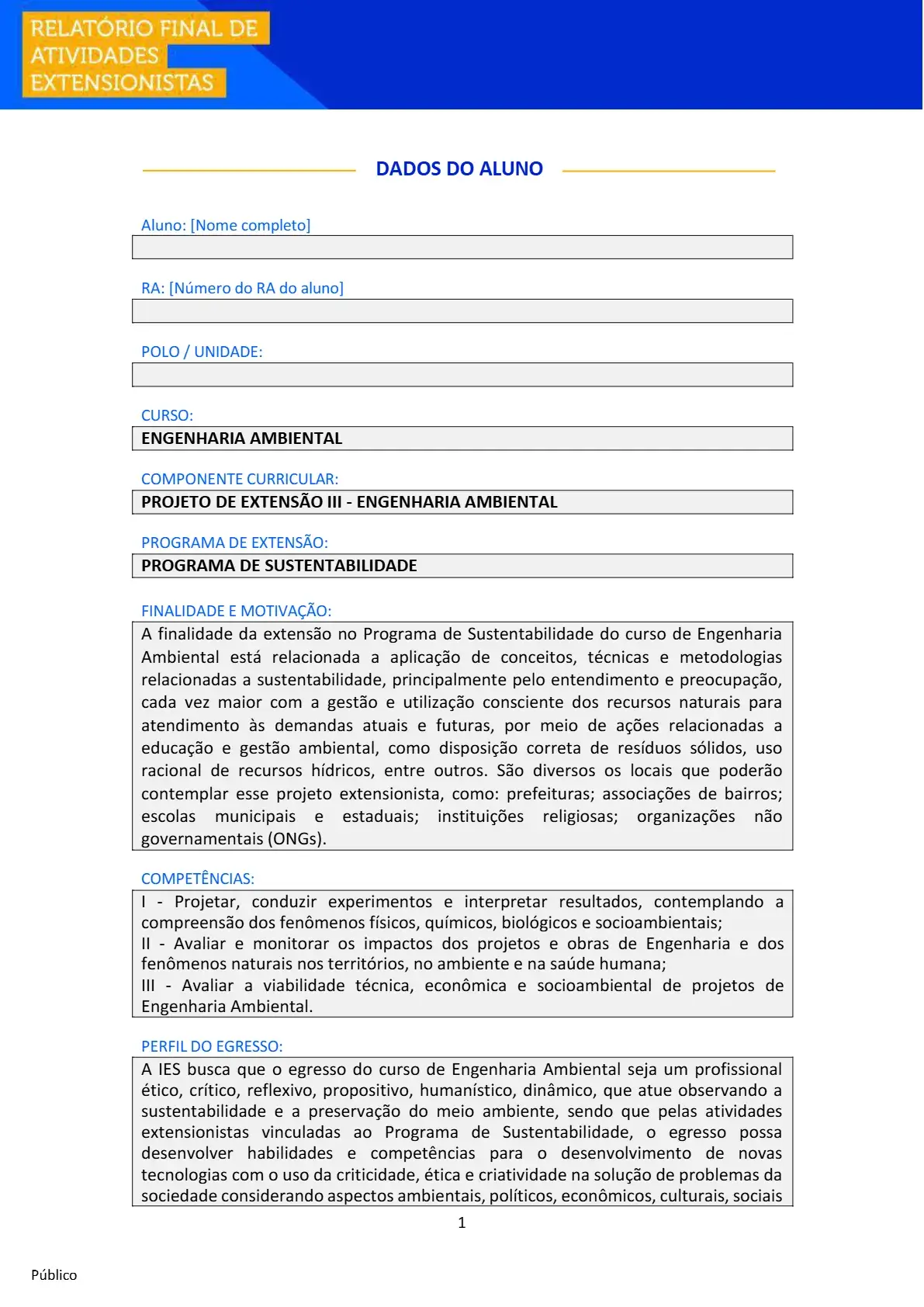 Aluno e Aluna, após realizar suas atividades de extensão, é necessário que você o formalize, enviando esse Relatório Final para ser avaliado junto ao seu Ambiente Virtual (AVA) e também para você poder comprovar sua atuação.