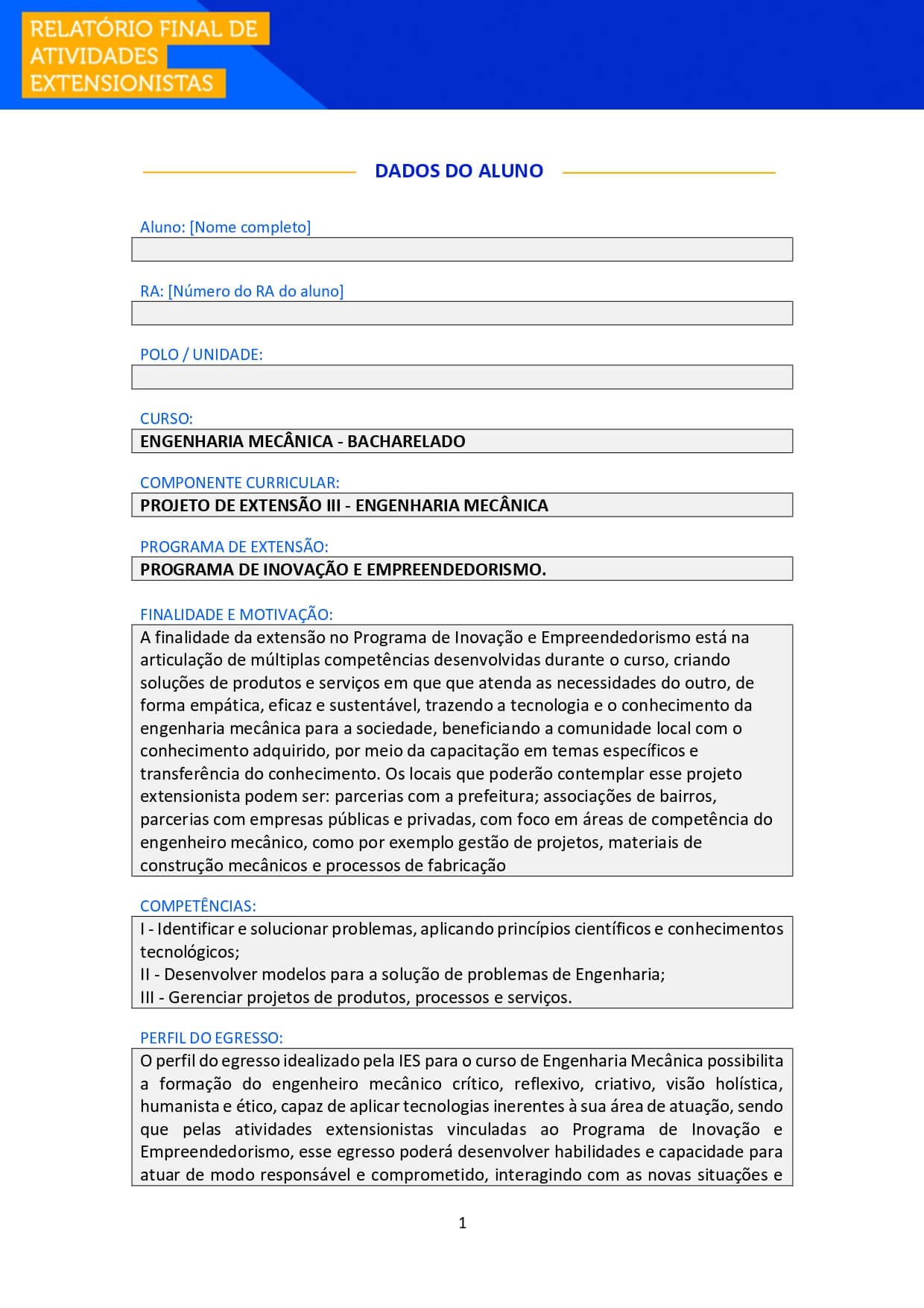 A finalidade da extensão no Programa de Inovação e Empreendedorismo está na articulação de múltiplas competências desenvolvidas durante o curso, criando soluções de produtos e serviços em que que atenda as necessidades do outro, de forma empática, eficaz e sustentável, trazendo a tecnologia e o conhecimento da engenharia mecânica para a sociedade, beneficiando a comunidade local com o conhecimento adquirido, por meio da capacitação em temas específicos e transferência do conhecimento. Os locais que poderão contemplar esse projeto extensionista podem ser: parcerias com a prefeitura; associações de bairros, parcerias com empresas públicas e privadas, com foco em áreas de competência do engenheiro mecânico, como por exemplo gestão de projetos, materiais de construção mecânicos e processos de fabricação