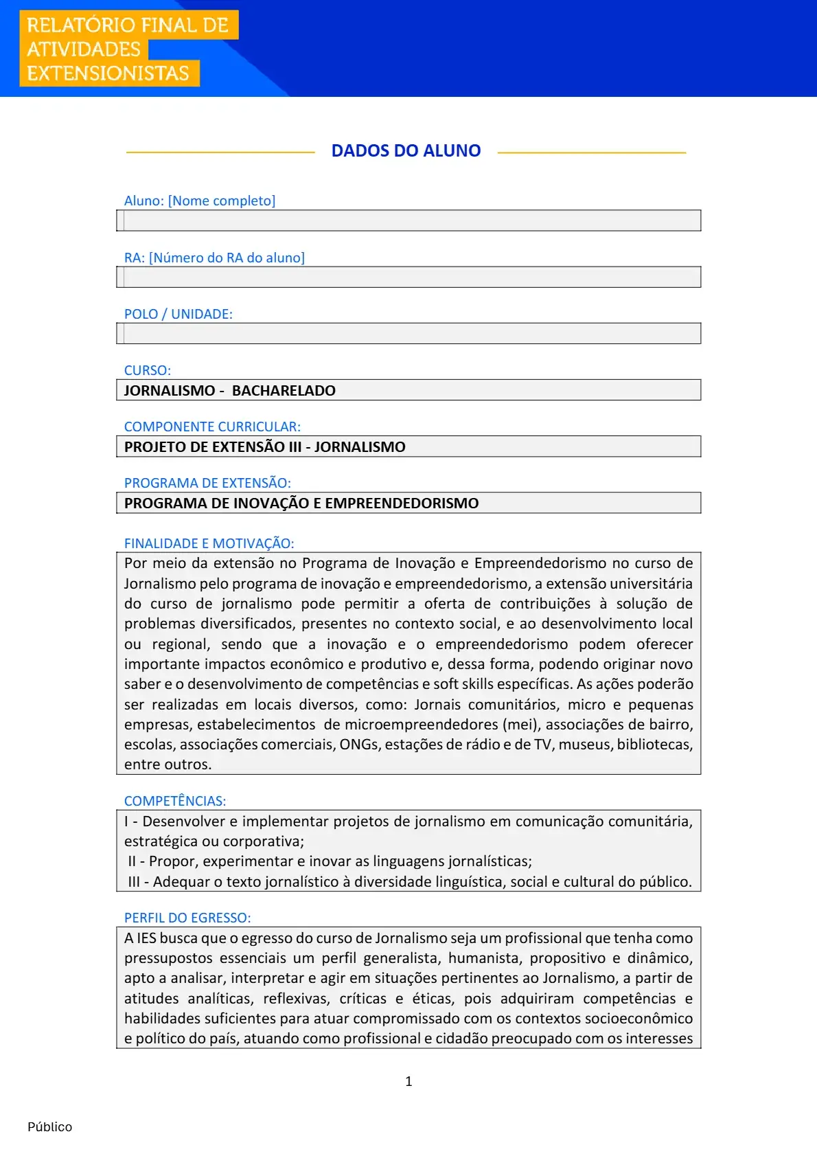 Aluno e Aluna, após realizar suas atividades de extensão, é necessário que você o formalize, enviando esse Relatório Final para ser avaliado junto ao seu Ambiente Virtual (AVA) e também para você poder comprovar sua atuação.